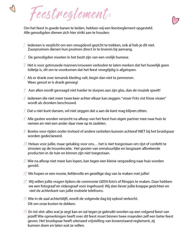 Een trouwdag draait om liefde, emoties én natuurlijk plezier. Steeds vaker kiezen bruidsparen ervoor om hun gasten te verrassen met een eigen, humoristisch feestreglement. Dit luchtige document, opgesteld door en voor het bruidspaar, geeft op een grappige manier de ‘spelregels’ van het feest weer. Het is geen saai papierwerk, maar een vrolijke knipoog die meteen voor een glimlach zorgt.